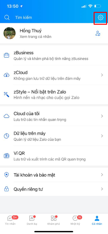 Bước 1: Truy cập vào Zalo > Chọn vào biểu tượng cài đặt nằm ở bên trên góc phải màn hình.