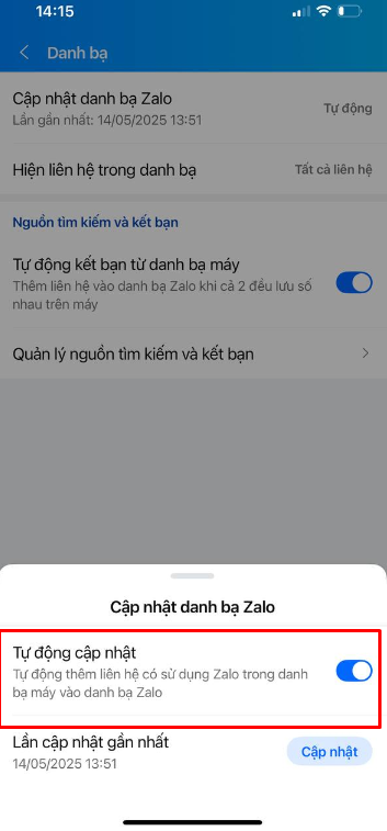 Bước 3: Nhấn vào Cập nhật danh bạ Zalo => Bật Tự động cập nhật